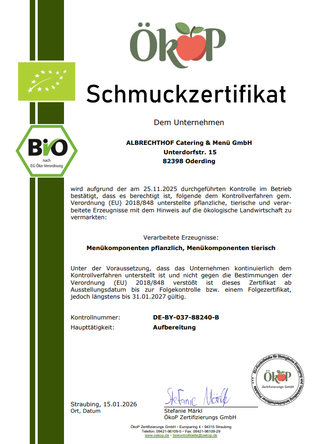 Die ALBRECHTHOF Catering & Menü GmbH ist ein EU-zertifizierter Betrieb nach Art. 4 Verordnung (EG)-Nr. 853/2004. Seit 2006 unterliegen Betriebe der Gemeinschaftsverpflegung wie wir der Zulassungspflicht.